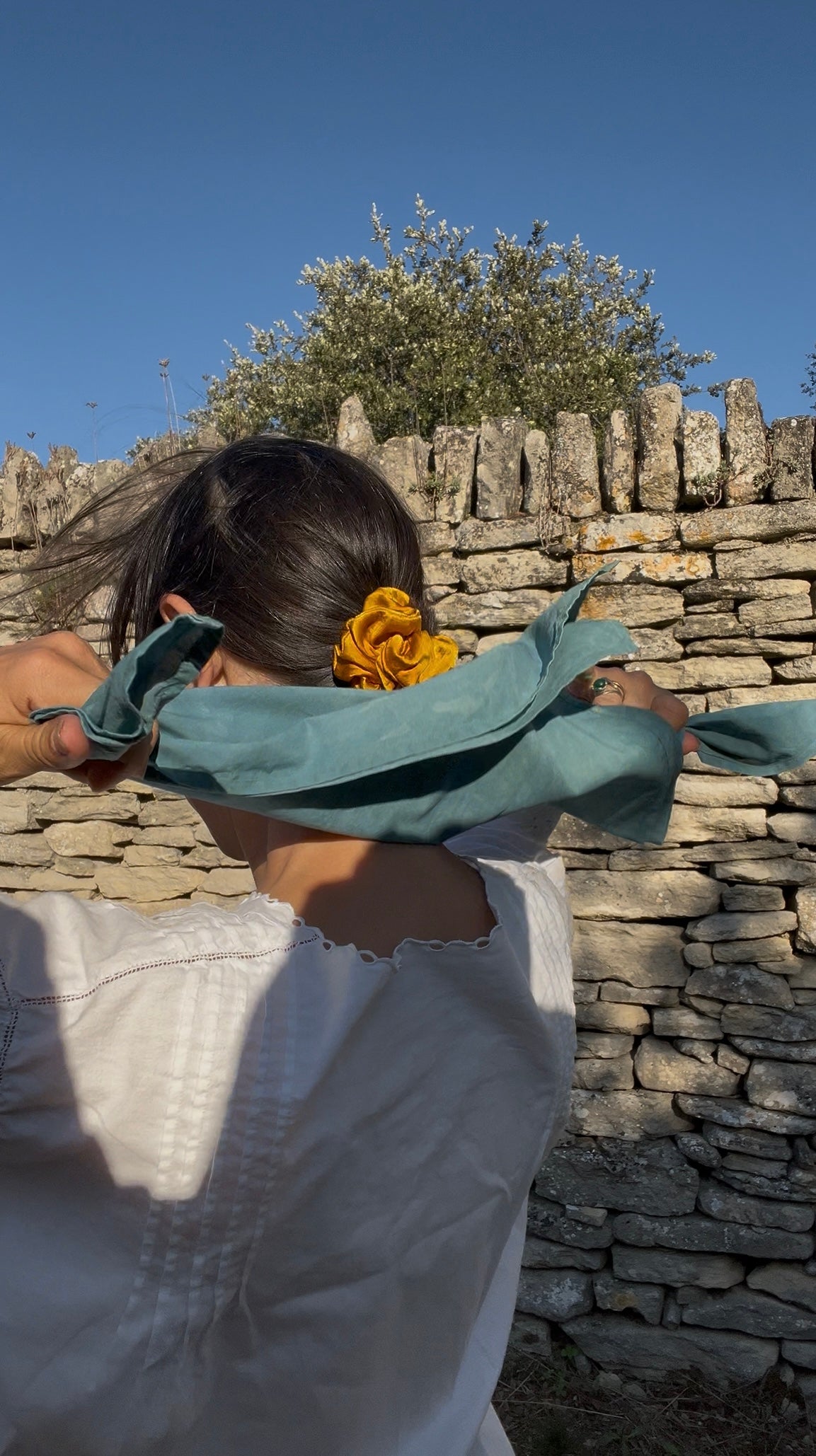 Ce bandana en coton bio a été teint à la main, en pleine conscience dans mon jardin avec des plantes que je cultive, récolte ou composte. Chaque pièce est différente, unique et je l'espère vous apportera beaucoup de bonheur.