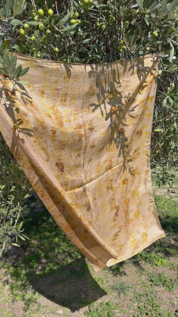 Ce foulard en soie a été teint à la main, en pleine conscience dans mon jardin avec des plantes que je cultive, récolte ou composte. Chaque pièce est différente, unique et je l'espère vous apportera beaucoup de bonheur.