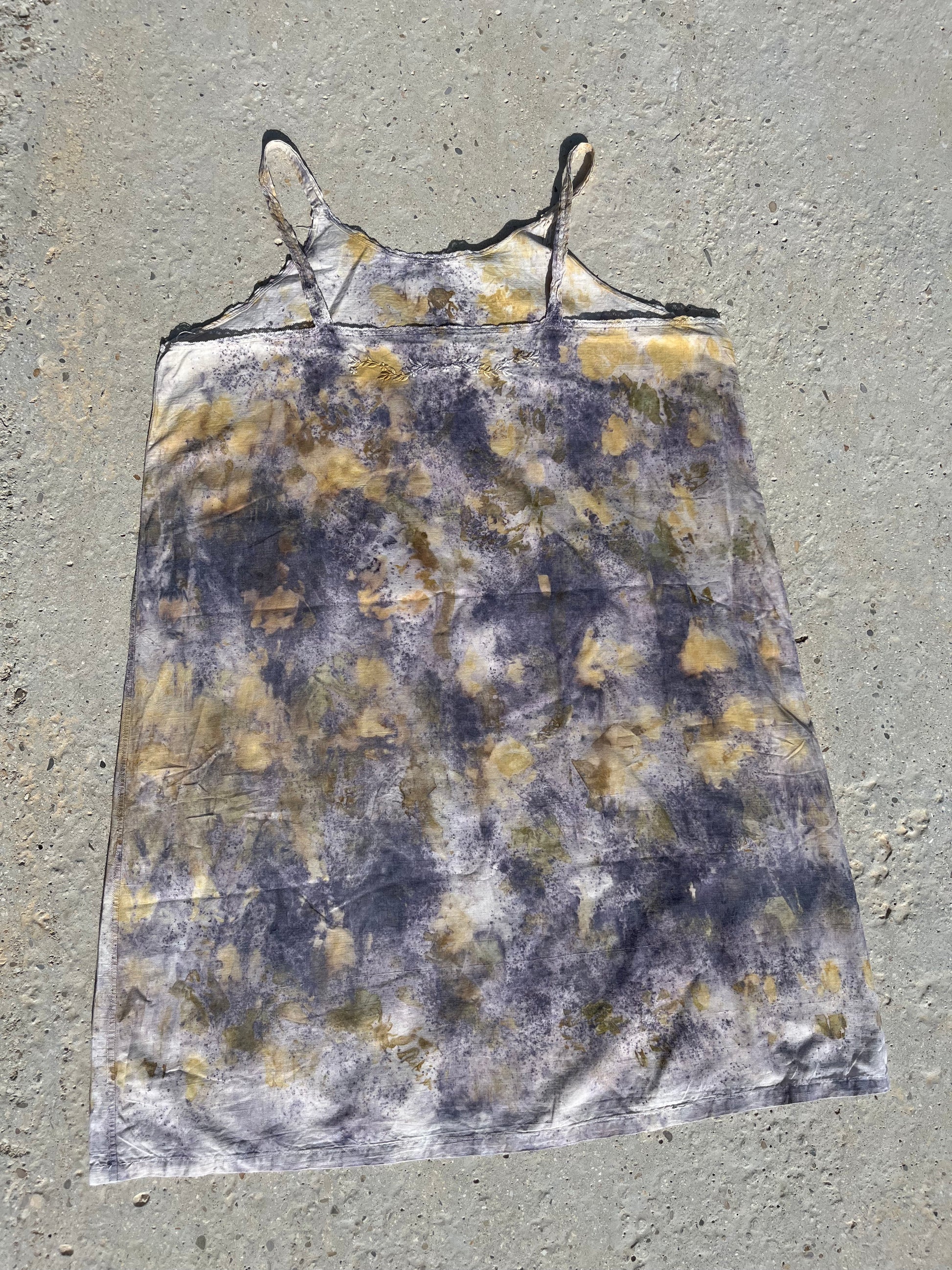 Une deuxième vie pour cette nuisette ancienne teinte à la main, en pleine conscience dans mon jardin avec des plantes que je cultive, récolte ou composte afin de lui offrir une seconde vie. Chaque pièce est différente, unique et je l'espère vous apportera beaucoup de bonheur.