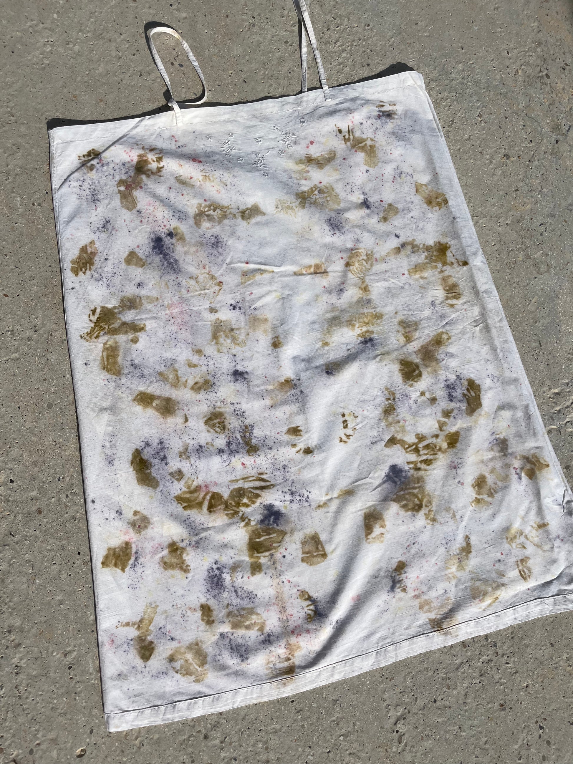Une deuxième vie pour cette nuisette ancienne teinte à la main, en pleine conscience dans mon jardin avec des plantes que je cultive, récolte ou composte afin de lui offrir une seconde vie. Chaque pièce est différente, unique et je l'espère vous apportera beaucoup de bonheur.